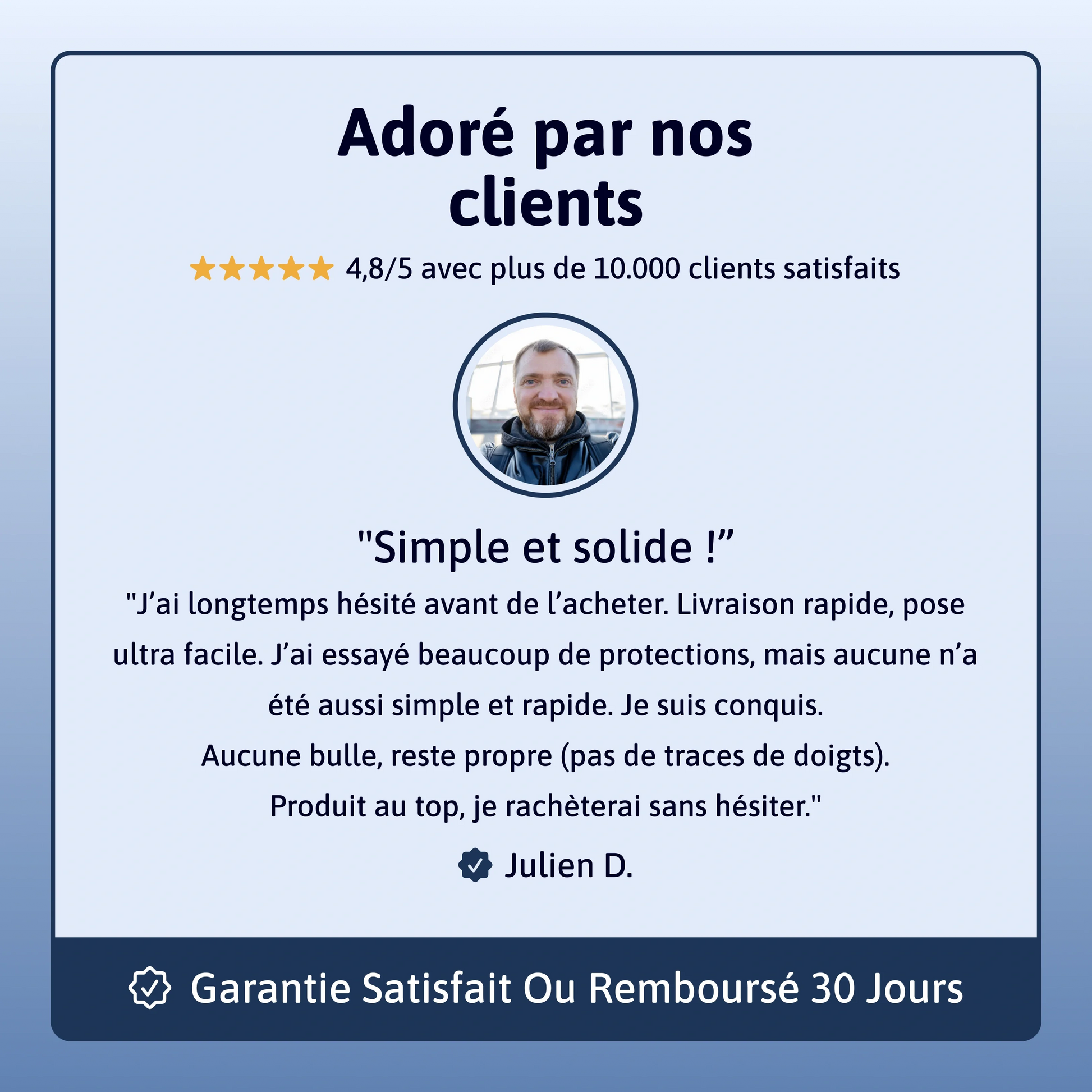 Garantie à vie incluse. Remplacement gratuit si la protection se brise.